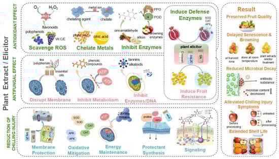 Plant-derived extracts or hormonal elicitors may be used individually or within formulations to prevent spoilage by inhibiting the growth of bacteria and fungi and to prolong shelf life by inhibiting oxidation and respiration (Figure 2). Fresh-cut harvested fruit is vulnerable to pests, microbial attack, physical changes, and biochemical degradation [14]. Plant-based preservatives, primarily those containing high concentrations of polyphenols and carotenoids, are now widely adopted across food sectors. These substances possess antimicrobial properties and antioxidants that efficiently lower free radical activity after harvest, preventing the development of off-flavors, enhancing color stability, and prolonging shelf life [4,15]. These natural compounds may be able to replace synthetic counterparts, for example, in edible antioxidant/antimicrobial coatings on fresh fruit (grapes (V. vinifera L. cv. ‘Sultani Çekirdeksiz’) [16], nectarines (Prunus persica) [17], strawberries (Fragaria x ananassa Duch.) [18], guavas (Psidium guajava L.) [19], apricots (Prunus armeniaca L.) [20] and sweet cherries (Prunus avium L.) [21]. In the following section, detailed information regarding these plant-derived extracts and their applications is presented [22].