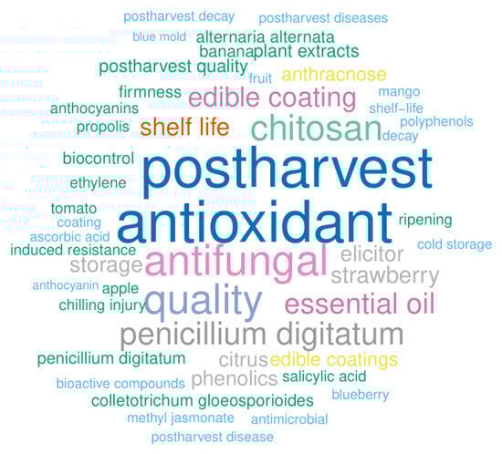Authors employ keywords to provide a brief, clear, representative, description of the study content; therefore keyword analysis may be used to identify popular topics and themes in a research area [24]. To efficiently identify the most common study subjects and active research hotspots in scientific disciplines and sectors [25], the word cloud of author keywords is displayed (Figure 4) [26]. The greater the keyword collection, the more frequently it appeared in a dataset [27]. The keyword “antioxidant” (total frequency of 97) was the most frequent, indicating that antioxidant is one of the most attention-attracting topics for studies on fruit preservation with plant extracts or elicitors. The terms “postharvest” (95), “antifungal” (67), “quality” (65), “essential oil” (40), “edible coating” (39), “shelf life” (33), “botrytis cinerea” (47), “elicitor” (27), “phenolic” (25), “anthracnose” (21), “plant extracts” (18), “penicillium digitatum” (17), “colletotrichum gloeosporioides” (17), “alternaria alternata” (16), “ethylene” (14), “induced resistance” (14), “salicylic acid” (14), and “methyl jasmonate” (12) have all contributed significantly to the literature on plant-based preservatives.