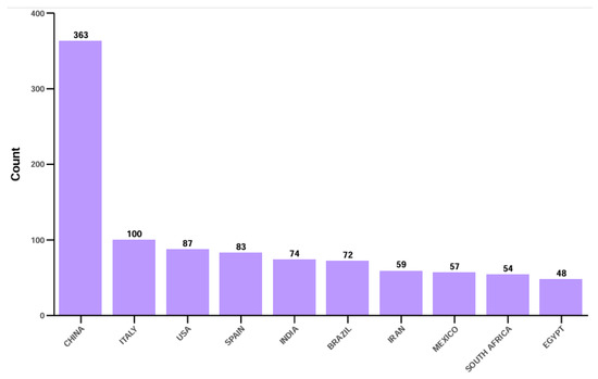 The analysis of English language publications by categorizing statistical data on fruit preservation with plant extracts or elicitors published on Web of Science revealed a diverse landscape of research contributions from the top ten countries/territories with a total number of 997 publications representing 85.95% of the total (Figure 5). China ranks first among these nations with 363 publications. Italy is ranked the second with 100 publications. USA, Spain, India and Brazil are placed the third, fourth, fifth and sixth, respectively, with 87, 83, 74 and 72 research publications. The concentration of research in these top countries highlights their significant roles in both global fruit production and scientific innovation, while also suggesting a potential disparity in research focus and resource allocation across different regions. This trend may reflect these nations’ urgent need to reduce postharvest losses and aligns with their strategic agricultural economic interests.