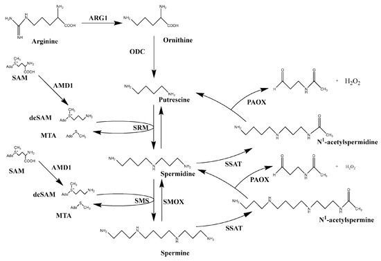 - Kakkar, R.K.; Sawhney, V.K. Polyamine research in plants–a changing perspective. Physiol. Plant. 2002, 116, 281–292. [Google Scholar] [CrossRef]