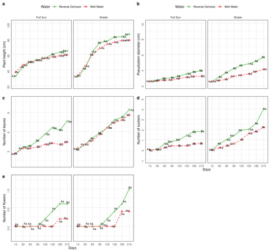 Morphological traits of Musa haekkinenii in response to varying light intensities (full sun and shade) and water quality treatments (reverse osmosis and well water) over time. (a) Plant height (cm). (b) Pseudostem diameter (cm). (c) Number of leaves. (d) Number of suckers. (e) Number of flowers. Data is presented as adjusted mean from linear mixed-effects model. Different letters indicate statistically significant differences among treatments, where uppercase letters denote variations between light intensities and lowercase letters correspond to differences between water quality treatments, as determined by Tukey’s test (p < 0.05, n = 20).