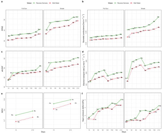 Physiological responses of Musa haekkinenii to varying light intensities (full sun and shade) and water quality treatments (reverse osmosis and well water) over time. (a) Chlorophyll content was measured using the SPAD index. (b) Stomatal conductance (gs, mol m−2 s−1). (c) Chlorophyll content was measured using the atLEAF index. (d) Electron transport rate (ETR, µmol electrons m−2 s−1). (e) Normalized Difference Vegetation Index (NDVI). (f) Vapor pressure deficit (VPD, kPa). Data is presented as adjusted mean from linear mixed-effects model. Statistically significant differences between light intensities are indicated by distinct uppercase letters, while differences between water quality treatments are denoted by lowercase letters, according to Tukey’s test (p < 0.05, n = 20).