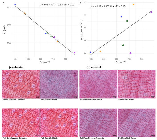 Stomatal anatomical responses of Musa haekkinenii at 210 days after treatment under contrasting light intensities (full sun vs. shade) and irrigation water qualities (reverse osmosis vs. well water). (a) Relationship between maximum stomatal density (Ds, mm−2) and stomatal size (Ss, µm2) for each treatment combination, measured on abaxial (●) and adaxial (▲) leaf surfaces. (b) Theoretical maximum stomatal conductance (gsmax, mol m−2 s−1) plotted against Ds, illustrating variation in gas exchange potential across treatments and leaf surfaces. (c) Photomicrographs of the abaxial epidermis (40× g magnification), showing stomatal morphology and density under each treatment condition. (d) Photomicrographs of the adaxial epidermis (40× g magnification). Color coding reflects treatment combinations: full sun + reverse osmosis (orange), full sun + well water (purple), shade + reverse osmosis (green), and shade + well water (blue). Scale bars = 50 µm.