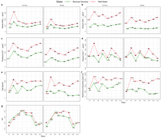 Nutrient leaching and substrate salinity dynamics of Musa haekkinenii in response to varying light intensities (full sun and shade) and water quality treatments (reverse osmosis and well water) over time. (a) Nitrate (NO3−, ppm). (b) Sodium (Na+, ppm). (c) Potassium (K+, ppm). (d) Calcium (Ca2+, ppm). (e) Salt concentration (ppm). (f) Electrical conductivity (EC, µS/cm). (g) pH. Data is presented as adjusted mean from linear mixed-effects model. Statistically significant differences between light intensities are indicated by distinct uppercase letters, while differences between water quality treatments are denoted by lowercase letters, according to Tukey’s test (p < 0.05, n = 20).