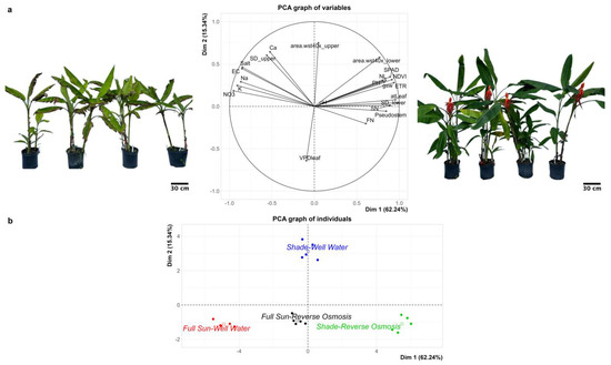Collectively, the PCA underscores that integrating moderate light intensity (shade) with high-quality irrigation (reverse osmosis) provides the most favorable conditions for maximizing growth, physiological performance, and anatomical integrity in Musa haekkinenii. This combination minimizes salinity-related constraints while enhancing photosynthetic and morphological traits, offering a strategic framework for sustainable and commercially viable ornamental production.