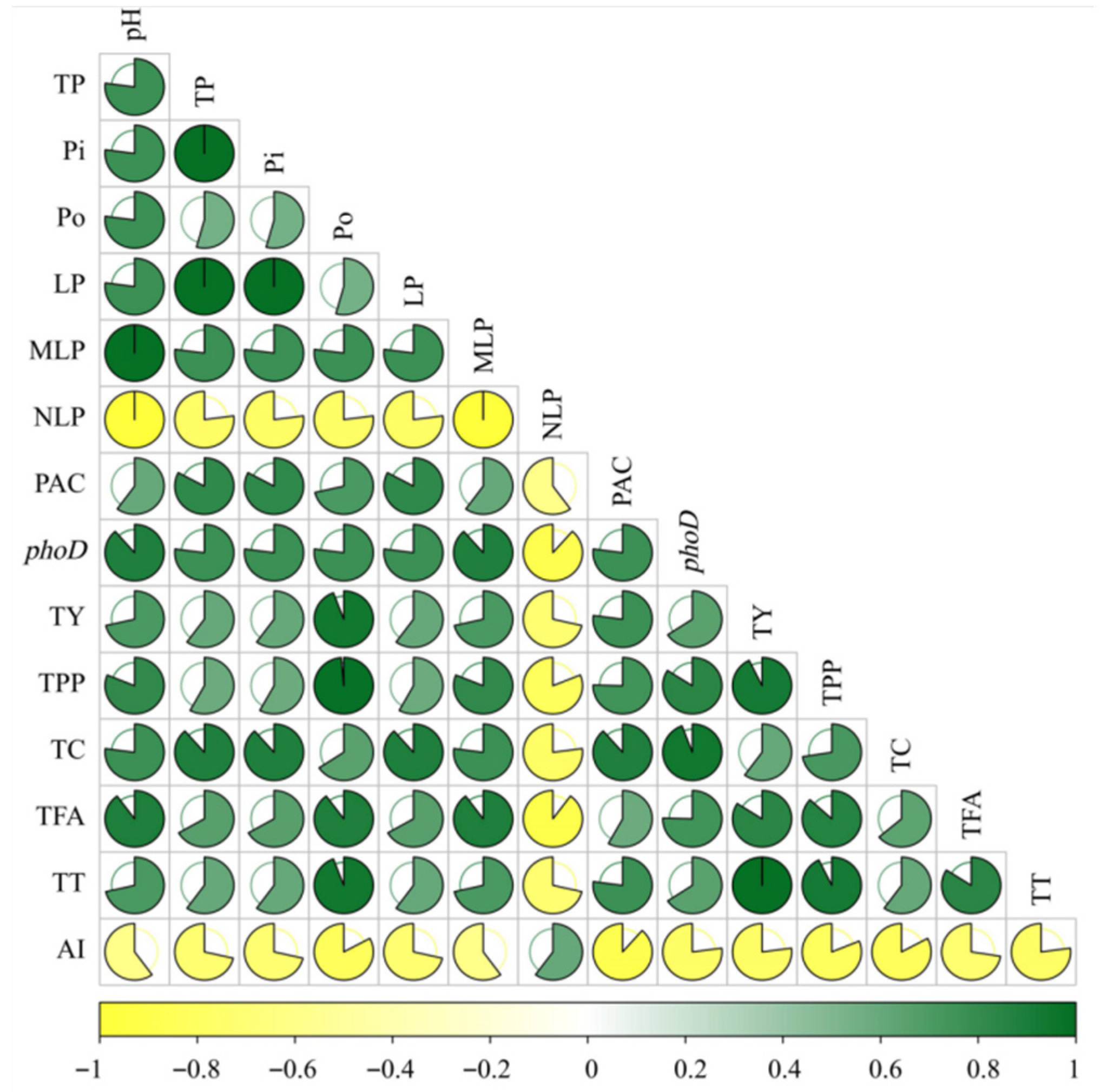 - Wang, M.M.; Wu, Y.C.; Zhao, J.Y.; Liu, Y.; Chen, Z.; Tang, Z.Y.; Tian, W.; Xi, Y.G.; Zhang, J.B. Long-term fertilization lowers the alkaline phosphatase activity by impacting the phoD-harboring bacterial community in rice-winter wheat rotation system. Sci. Total Environ. 2022, 821, 153406. [Google Scholar] [CrossRef]