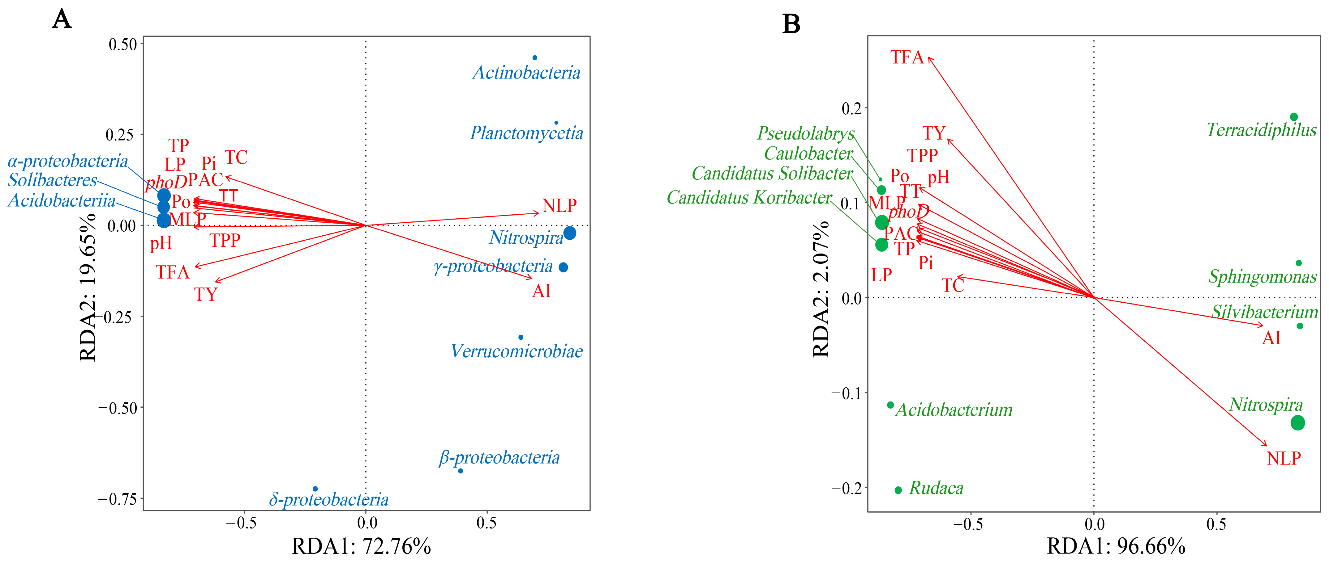 - Hu, Y.J.; Xia, Y.H.; Sun, Q.; Liu, K.P.; Chen, X.B.; Ge, T.D.; Zhu, B.L.; Zhang, Z.H.; Su, Y.R. Effects of long-term fertlization on phoD-harboring bacterial commurity in Karst soils. Sci. Total Environ. 2018, 628, 53–63. [Google Scholar] [CrossRef]