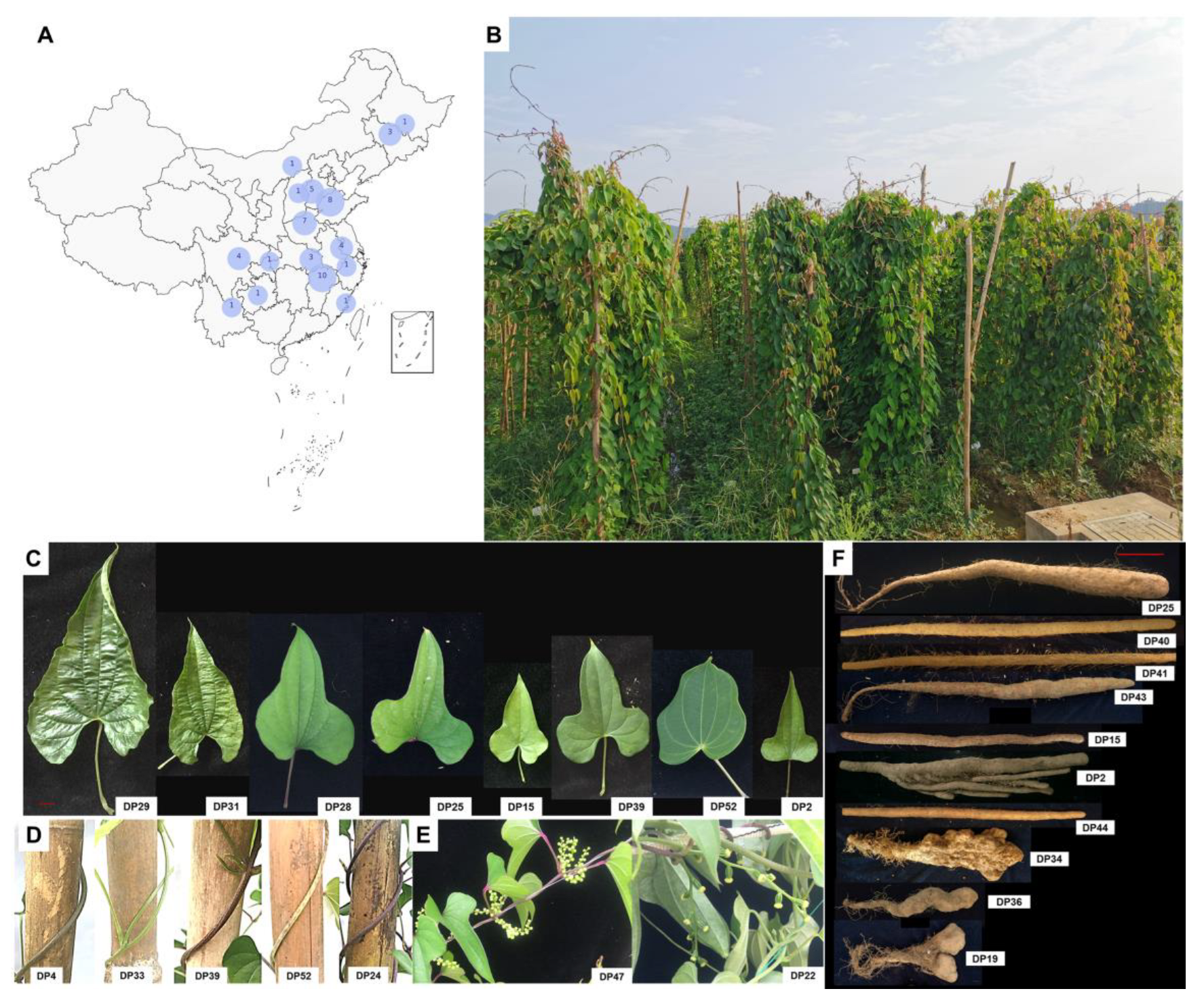 - Huang, Y.X.; Wang, F.Q.; Du, J.F.; Hua, S.M.; Lei, F.G.; Xu, X.M.; Liang, K.J.; Zhang, Z.Y. Numerical analysis of morphological variation of germplasm resources of Dioscorea. China J. Chin. Mater. Medica 2013, 38, 318–324. [Google Scholar]