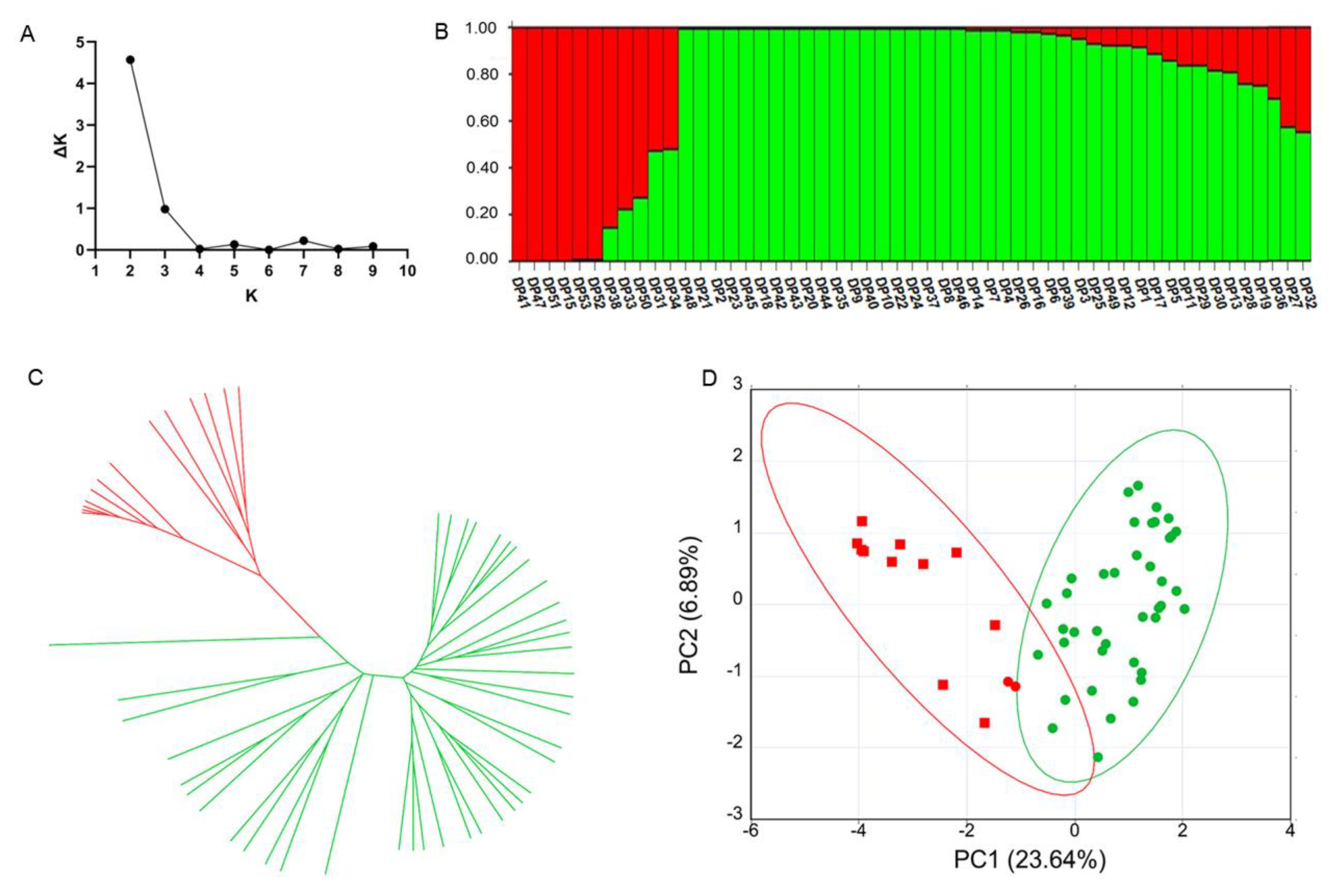 - Evanno, G.; Regnaut, S.; Goudet, J. Detecting the number of clusters of individuals using the software STRUCTURE: A simulation study. Mol. Ecol. 2005, 14, 2611–2620. [Google Scholar] [CrossRef]