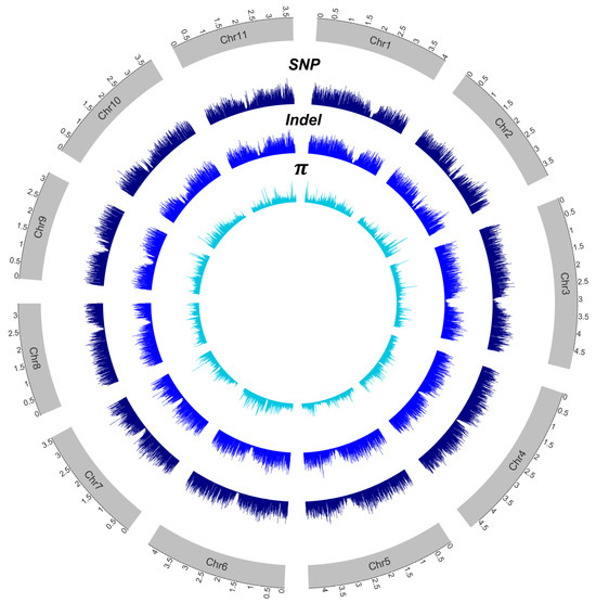 A circos plot illustrating the density of identified variants and genetic diversity (π). π was calculated using all 62 samples. The unit is in Mb.