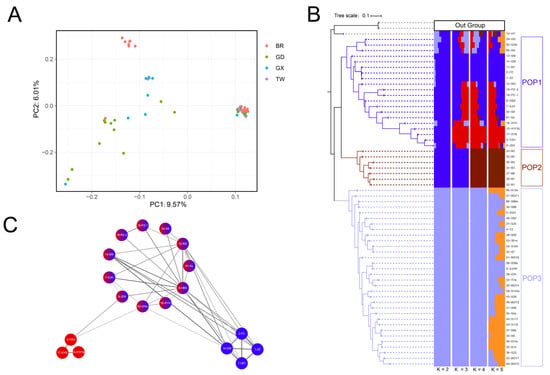 Phylogeny, population structure, and kinship analysis of guava germplasm accessions. (A) Principal component analysis (PCA), in which the color of each dot represents the recorded geographic origin of the accession, including Brazil (BR), Guangdong (GD), Guangxi (GX), and Taiwan (TW), China. (B) Phylogenetic tree and population structure analysis. Based on the phylogenetic relationships, population structure, and geographic origins, the guava accessions were grouped into three sub-populations (POP1, POP2, and POP3). (C) Identity-by-descent (IBD) network of accessions within POP1. The network, including blue, red, and admixed (red-blue) accessions, was visualized using Cytoscape (v3.10.3). The color intensity of the connecting edges indicates IBD values, with darker lines representing closer genetic relationships.