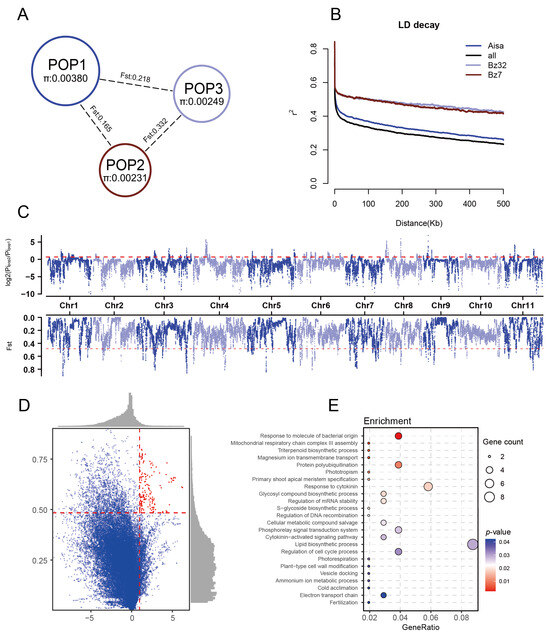 Two parameters were used to detect candidate genomic regions under selection between populations. The first was nucleotide diversity (π) [25,26,27], where the π-ratio (πPOP3/πPOP1) was used to assess diversity differences between populations. The second was the fixation index (FST) [28]. Both metrics were calculated using VCFtools (v0.1.16) with a sliding window size of 100,000 bp and step size of 10,000 bp [29]. Regions falling in the top 5% of both π-ratio and FST and overlapping were defined as candidate selective regions. Genes (along with their 2 kb upstream and downstream flanking sequences) located within these regions were considered candidate genes. GO enrichment analysis of these genes was conducted using the R package clusterProfiler (v4.2.2) [30].