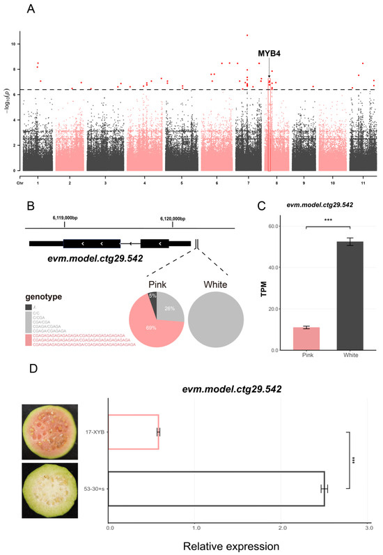 Genome-wide association analysis of loci associated with pink flesh color in guava. (A) Manhattan plot showing the GWAS results for pink versus white flesh color in guava. The black horizontal line indicates the Bonferroni-corrected significance threshold (−log10(1/n) = 6.40). The red dots represent variants exceeding this threshold. The candidate region is highlighted with a red box, and the arrow indicates the candidate gene within this region. (B) Genotypic distribution of the candidate gene and its associated upstream insertion variants. A total of 22 pink-fleshed and 10 white-fleshed accessions are included for calculation. (C) Expression levels of the candidate gene evm.model.ctg29.542 based on published transcriptome data comparing the pink-fleshed (‘Meiyin’) and white-fleshed (‘Zhenzhu’) guava accession. Asterisks indicate statistical significance (‘***’ for p < 0.001). (D) qRT-PCR of evm.model.ctg29.542 in the plink-fleshed (17-XYB) and white-fleshed (53-30+s) guava, with fruit transverse sections. Asterisks indicate statistical significance (‘***’ for p < 0.001).
