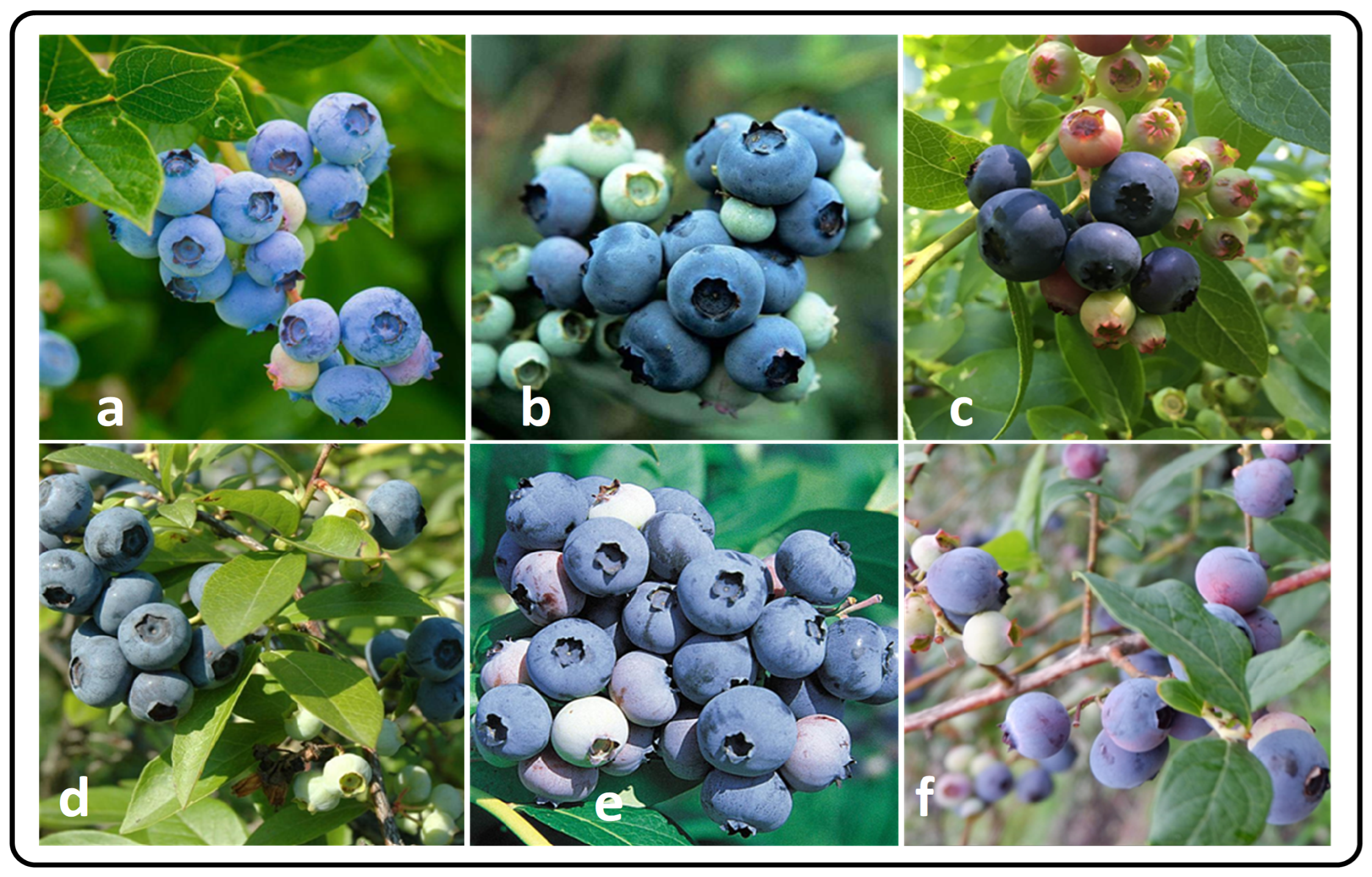 Figure 1. Examples of blueberries under different complex scenarios: (a) sunny, (b) cloudy, (c) backlight, (d) leaf occlusion, (e) densely clustered fruits, and (f) sparsely distributed fruits.