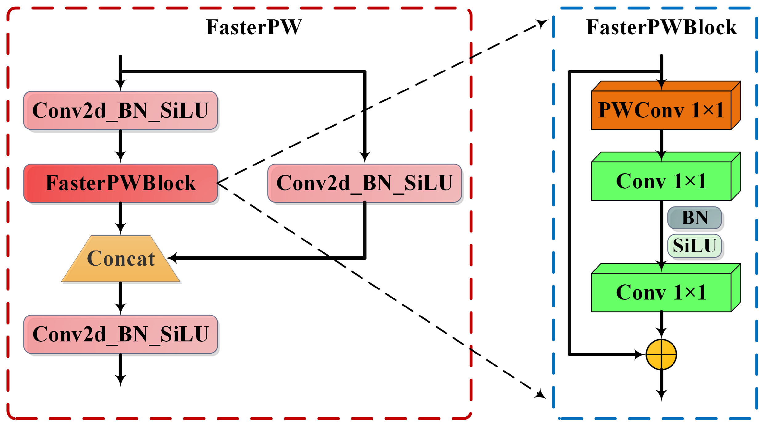 Based on this, the proposed FasterPW architecture (Figure 3) adopts a modular design comprising three standard convolutional layers and multiple FasterPWBlock modules, forming a lightweight feature extraction network. The core design principles include: (1) applying PWConv within FasterPWBlock for efficient channel interaction; (2) combining multiple FasterPWBlocks with standard convolutional modules (ConvModules) to build a hierarchical structure for robust spatial feature capture.