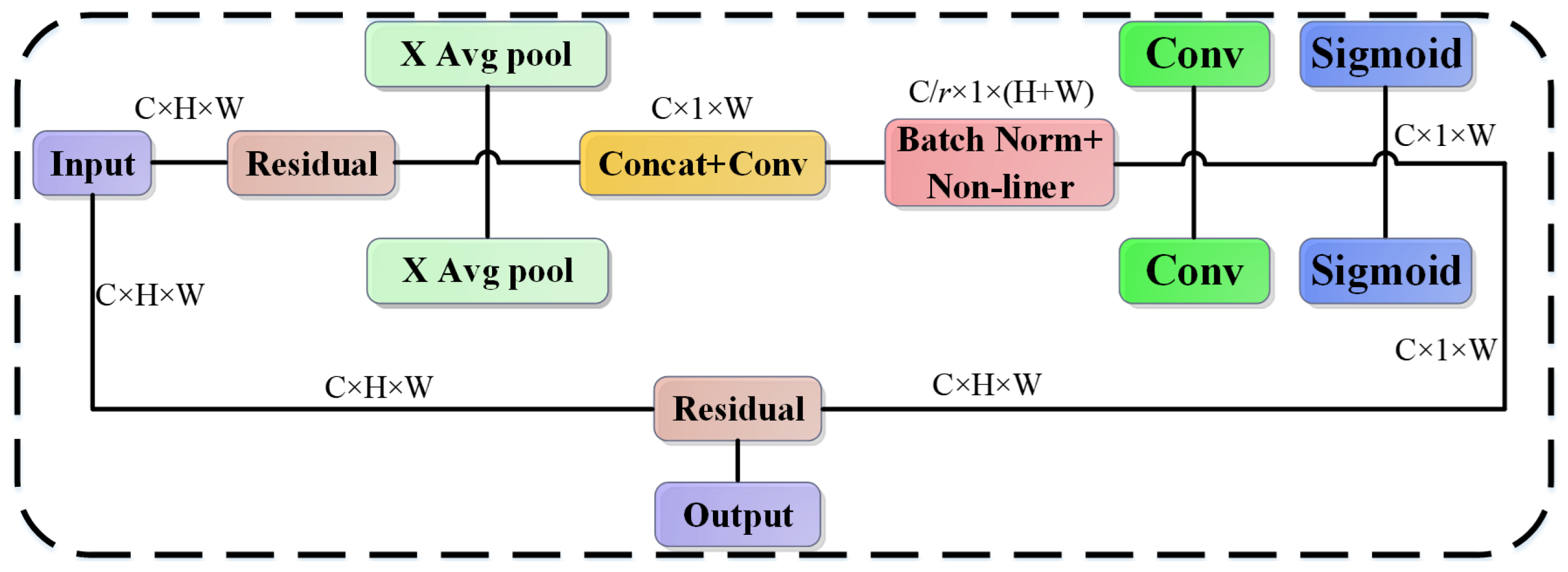 Finally, these attention weights are fused with the original feature map through element-wise multiplication, yielding the output feature map Y with embedded coordinate attention: