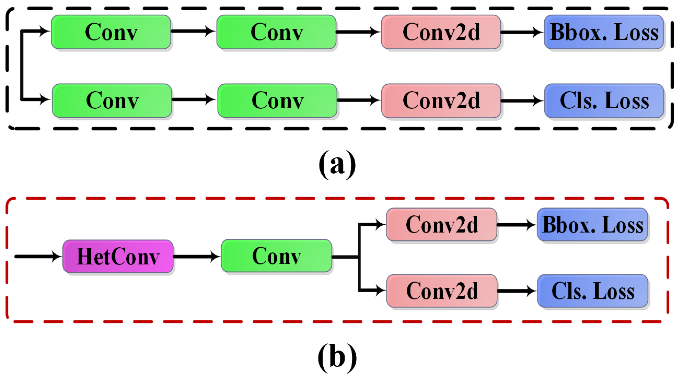 Figure 5. (a) The head of YOLOv8; (b) the head of BMDNet-YOLO.