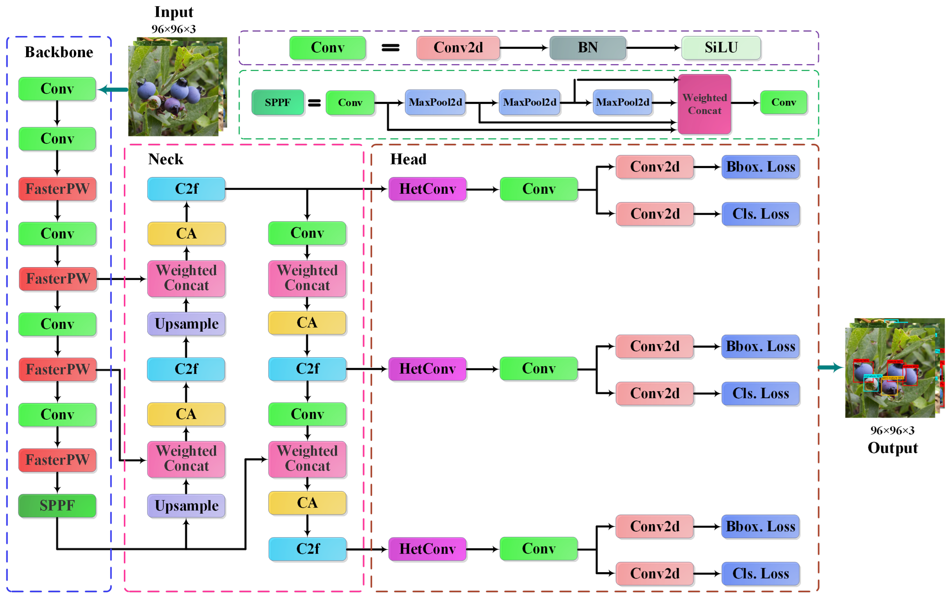 The overall architecture of the improved blueberry maturity detection model, BMDNet-YOLO, is illustrated in Figure 6. The model consists of four functional modules: input, backbone, neck, and detection head, forming an end-to-end feature extraction and detection framework. In the backbone, the original C2f module is replaced with the FasterPW module, which leverages partial convolution and channel reorganization to maintain multi-scale feature extraction capability while significantly reducing computational complexity and improving inference efficiency. To address illumination variation, leaf occlusion, and background interference in natural scenes, the CA mechanism is introduced into the neck, jointly modeling spatial and channel information to achieve precise attention on target regions and enhance feature representation of color gradients and texture details related to maturity. For improved multi-scale feature fusion, the traditional Concat operation is replaced by a Weighted Concat module, which applies dynamic channel-weighting to adaptively integrate shallow and deep features, assigning weights based on feature importance to strengthen morphological representations across different maturity stages. The detection head adopts a shared convolution structure based on HetConv. This design combines multi-scale kernels within a parallel parameter-sharing framework, reducing parameter redundancy while preserving multi-task inference performance, thereby achieving simultaneous improvements in detection accuracy and model lightweighting.