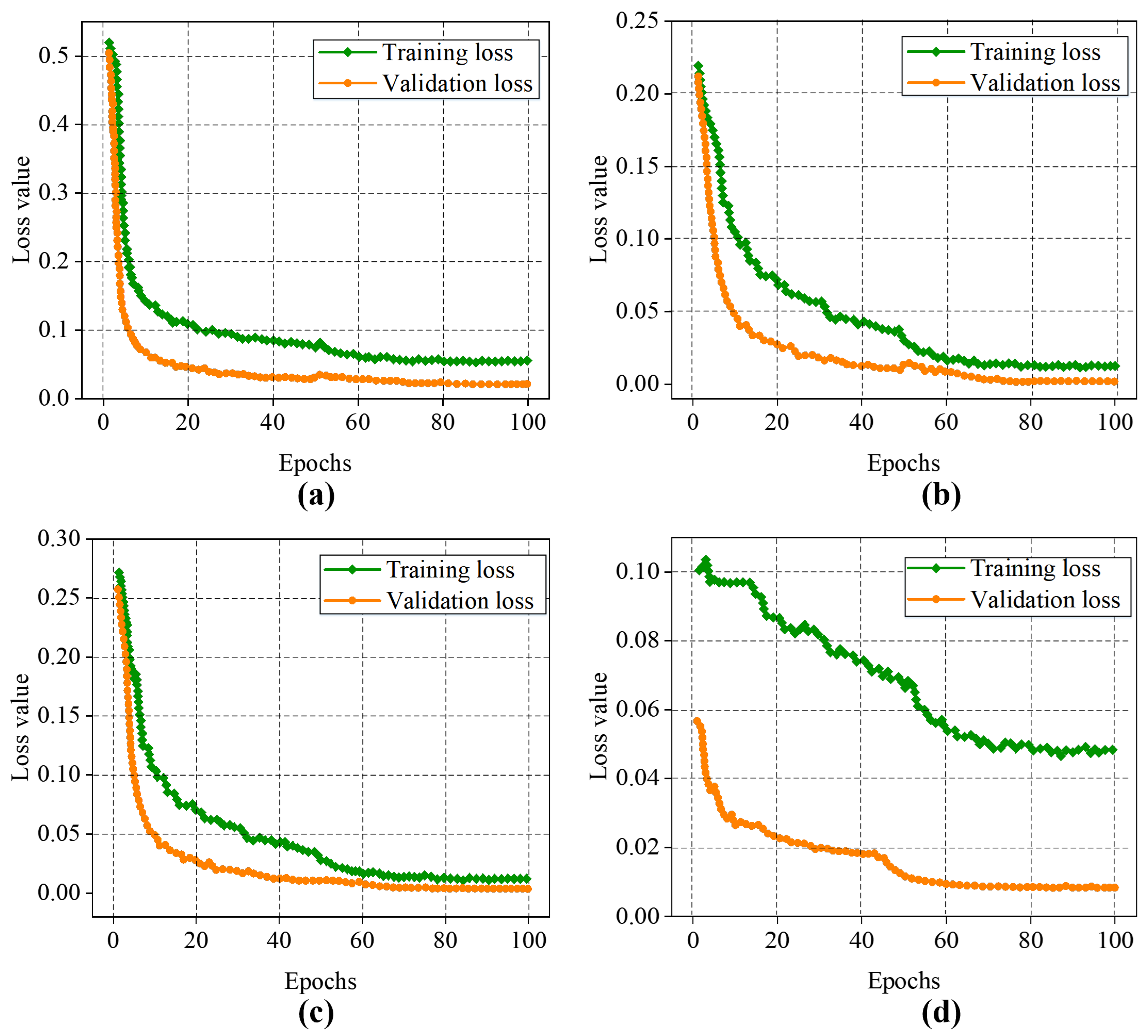 Figure 12. Loss variation curves before and after transfer learning: (a) YOLOv8n before transfer learning; (b) YOLOv8n after transfer learning; (c) BMDNet-YOLO before transfer learning; (d) BMDNet-YOLO after transfer learning.