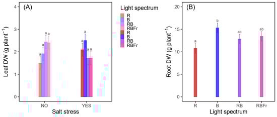 Dry weight (g) in Coleus blumei leaves and roots. (A) S:L interaction on leaves DW (g plant−1): bars are grouped by salinity level (NO–YES; 0 mM-120 mM NaCl) to highlight the combined effect of the two factors. (B) Light treatment effect on roots’ DW: colors represent different light spectra. Bars indicate SE (n = 4). Means with different letters are significantly different at the 5% level by Tukey’s adjustment.
