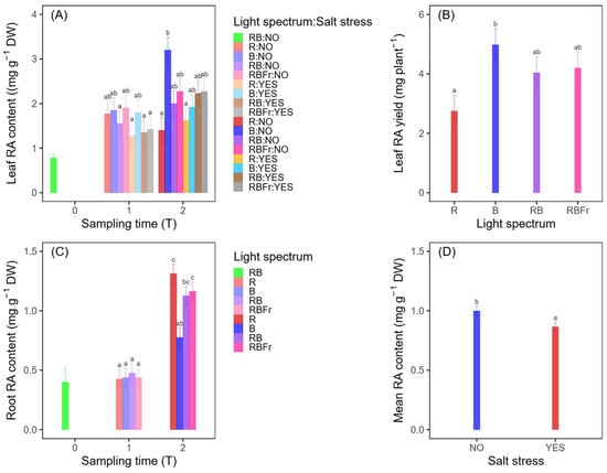 Figure 2C illustrates the RA concentration across different sampling time and light spectrum conditions. By T1, the RA concentration shows comparable results for all light treatments with no significant differences between them. At T2, a more pronounced differentiation among treatments is observed: R and RBFr treatments exhibit the highest root RA concentrations, significantly differing from the other treatments. The B treatment obtained the lowest RA concentration among T2 treatments, although still significantly higher than values observed at earlier time points. These results indicate that the sampling time has a strong effect on the root RA concentration, with a marked increase from T0 to T2. Unlike in leaves, roots’ RA biosynthesis is driven by the R spectrum, regardless of the presence of salt stress. Only time as single factor statistically affected the RA yield, with an increase of 410% from T1 to T2 and a mean value of 19.36 ± 1.20 mg plant−1 at T2 (Table 2).