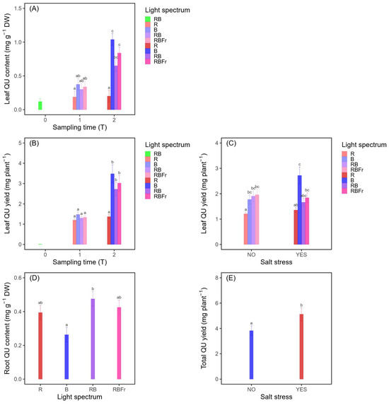 Leaves, roots, and total plant quercetin concentrations and yields across different time sampling and treatment conditions (light and salt stress). (A) L:T interaction effect on leaves’ QU concentration (mg g−1 DW): bars are grouped by sampling time to show the compound accumulation trend; colors represent different treatment combinations. (B) L:T interaction effect on leaves’ QU yield (mg plant−1). (C) S:L interaction effect on leaves’ QU yield: bars are grouped by salinity level (NO–YES; 0 mM-120 mM NaCl) to highlight the synergistic effect of the two factors. (D) Light effect on roots’ QU concentration (mg g−1 DW); colors represent different light treatments. (E) Salt stress effect on total plants’ mean QU yield; different colors represent the two salinity levels (0 mM–120 mM NaCl). Bars indicate SE (n = 4). Means with different letters are significantly different at the 5% level by Tukey’s test.