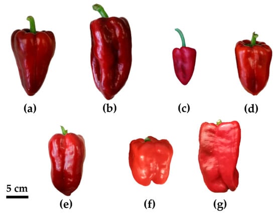 Appearance of the evaluated pepper genotypes at the fully ripe stage. Traditional varieties: (a) BGV13004, (b) Najerano, (c) Piquillo; experimental F1 hybrids: (d) H1, (e) H2; and commercial F1 hybrids: (f) Isabel F1 and (g) Cabañeros F1.
