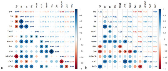 Correlation analyses between growth, phenolic compounds, and naphthodianthrone production and phenylpropanoid enzyme activities, non-enzymatic, and enzymatic antioxidant activities in Hypericum perforatum calli (a) and shoots (b) elicited with jasmonic acid. Blue-colored circles presented positive correlation, while red-colored circles showed negative correlation. Black asterisks represent the significance of correlation (p < 0.05). FW: fresh biomass; TP: total phenolics; TF: total flavonoids; TFL: total flavan-3-ols; TANT: total anthocyanins; HYP: hypericin; PHYP: pseudohypericin; PAL: phenylalanine ammonia-lyase; CHI: chalcone isomerase; NEAOP: non-enzymatic antioxidant properties; CAT: catalase; POD: peroxidase.
