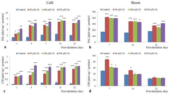 The PAL and CHI activities were also analyzed to investigate phenylpropanoid/flavonoid metabolic pathways in H. perforatum callus and shoot cultures upon elicitation with JA (Figure 5). Outgoing results demonstrated that both types of cultures responded to JA elicitation through up-regulation of PAL activity during the entire post-elicitation period. In this context, JA-elicited callus cultures showed a gradual enhancement in PAL activities from the beginning to the end of the post-elicitation period (from 2- to 3.6-fold) compared to the control callus (Figure 5a). Concerning JA-elicited shoots, the highest increment of PAL activity was observed at day 7 (about 2.4-fold), while at the end of post-elicitation, the enzyme activity was enhanced from 1.3- to 1.7-fold compared to control shoots (Figure 5b). Callus and shoot cultures showed distinct responses to CHI activity upon exogenously applied JA concentrations. The JA-elicited calli displayed an enormous increment of CHI activity (up to 25.3-fold) compared to control calli throughout the post-elicitation period (Figure 5c). In comparison to control shoots, CHI activity in shoot cultures was significantly up-regulated (from 1.2- to 1.7-fold) at day 7, while only 50 µM JA showed a 1.4-fold increased enzyme activity at day 14 of post-elicitation (Figure 5d).