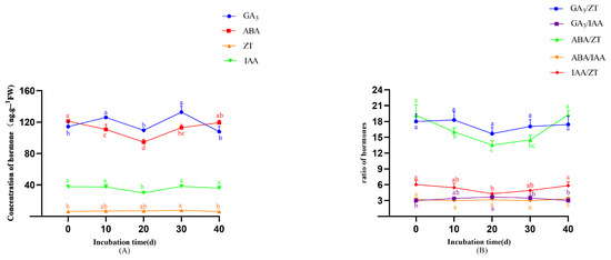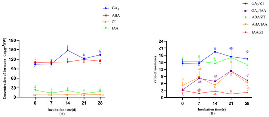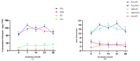 As shown in Figure 6B, ABA/ZT ratios increased during the early induction stage (0–14 days)”, “and IAA/ZT” was removed.