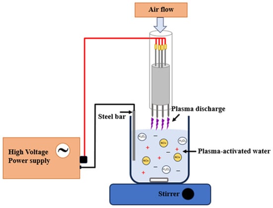 PAW was generated using direct arc plasma applied to the water surface. The direct arc plasma device consisted of four tungsten needles, each with 150 mm long with a diameter of 3.7 mm, sharply tapered at the nozzle, and enclosed in a nylon outer casing. A high-voltage fly back transformer delivering 15.8 kV (peak-to-peak) at 10 kHz AC pulses was applied to a quadruple metallic external electrode (Figure 1). The generated plasma was then directed toward 500 mL of distilled water for 5, 10, and 15 min to produce PAW, designated as PAW5, PAW10, and PAW15.