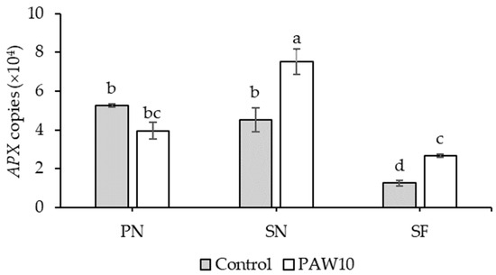 Interaction effect between cultivar and PAW treatment on the copy number of the APX gene in kangkong microgreens. PN: Phai-Ngern; SN: Senee 20; SF: Senafore 20. Control: seeds were soaked and irrigated with distilled water; PAW10: seeds were soaked and irrigated with plasma-activated water activated for 10 min. Values are means ± SD (n = 3). Treatments sharing the same lowercase letters are not significantly different according to Tukey’s HSD test (p < 0.05).