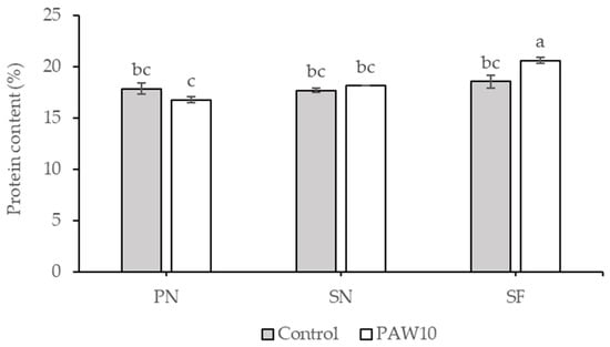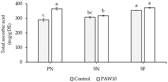 There was no significant interaction between cultivar and PAW treatment with respect to total phenolic and flavonoid contents (Table 9). The SN and SF cultivars exhibited the highest total phenolic and flavonoid contents, respectively. The PAW10 treatment significantly increased total phenolic and flavonoid contents by 17.95% and 12.73%, respectively, compared to the control. A significant interaction between cultivar and PAW treatment was observed for total ascorbic acid content (Table 9). In the PN cultivar, total ascorbic acid content increased significantly by 26.24% under the PAW10 treatment compared to the control, whereas the SN and SF cultivars showed no significant differences across treatments (Figure 3).