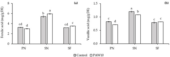 There was no significant interaction between cultivar and PAW treatment with respect to phenolic profile, except for ferulic acid and vanillic acid (Table 10). The highest content of chlorogenic acid and coumaric acid was observed in SF cultivar, while the highest content of rutin was found in SN cultivar. However, no significant differences were observed in the contents of chlorogenic acid, coumaric acid, and rutin between the PAW10 and control treatments. The ferulic acid content in the SN cultivar increased significantly by 10.08% under the PAW10 treatment compared to the control, while no significant differences were observed in the PN and SF cultivars across treatments (Figure 4a). In contrast, the vanillic acid content in the PN and SN cultivars decreased by 13.12% and 9.78%, respectively, under the PAW10 treatment compared to the control, whereas the SF cultivar showed no significant differences across treatments (Figure 4b).