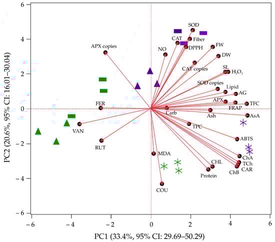 PCA revealed distinct cultivar-specific metabolic responses to PAW10 treatment. The SF cultivar exhibited the most pronounced shift, moving from the negative side of PC2 (control) to the positive side of PC1 (PAW10), correlating with significant increases in antioxidant and antiglycation activities, as well as key bioactive compounds. This indicates that PAW10 effectively enhances health-promoting phytochemicals in SF, supporting previous reports of PAW-induced phytochemical accumulation and antioxidant activity in plants [11,16,21,68]. In contrast, the PN cultivar under PAW10 aligned with elevated SOD activity and fiber content along PC2, suggesting a distinct antioxidant response involving enzyme-mediated ROS detoxification [64]. The SN cultivar showed minimal changes, indicating limited responsiveness to PAW10. These findings highlight genotype-dependent metabolic variations in response to elicitor treatments [29] and emphasize the potential of SF for nutritionally enhanced microgreen production. Selecting appropriate cultivars is crucial for targeted metabolic improvements in functional food development [77].