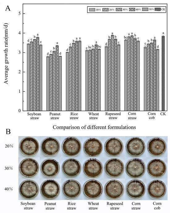 As shown in Table 1, rice straw, rapeseed straw, wheat straw, soybean straw, peanut straw, corn straw, corn cobs, and sawdust passed through a 10-mesh sieve (with an aperture of approximately 2.00 mm were used as the main raw materials, and a total of 5 substitution ratios (10%, 20%, 30%, 40%, and 50%) were selected. All raw materials were mixed evenly and then spread in glass Petri dishes (9 cm in diameter). After being autoclaved at 121 °C and cooled, they were set aside for later use. The activated H. erinaceus blocks (3 mm in diameter) were inoculated in the center of each Petri dish, which was then placed in a constant-temperature incubator at 25 °C for cultivation in the dark, with 3 biological replicates set for each formula. The mycelial growth rate was measured using the “cross” marking method [32,33], with records taken every 24 h for 10 consecutive days. Data were recorded daily for 10 consecutive days, and the average daily mycelial growth rate was calculated. Meanwhile, the mycelial growth status of H. erinaceus under different formulations was observed via morphological methods. Density: Dense > Moderate > Sparse; Thickness: Thick > Thin; Color: Pure white > Bright white. Based on the above results, the formulations and ratios for subsequent experiments were selected.