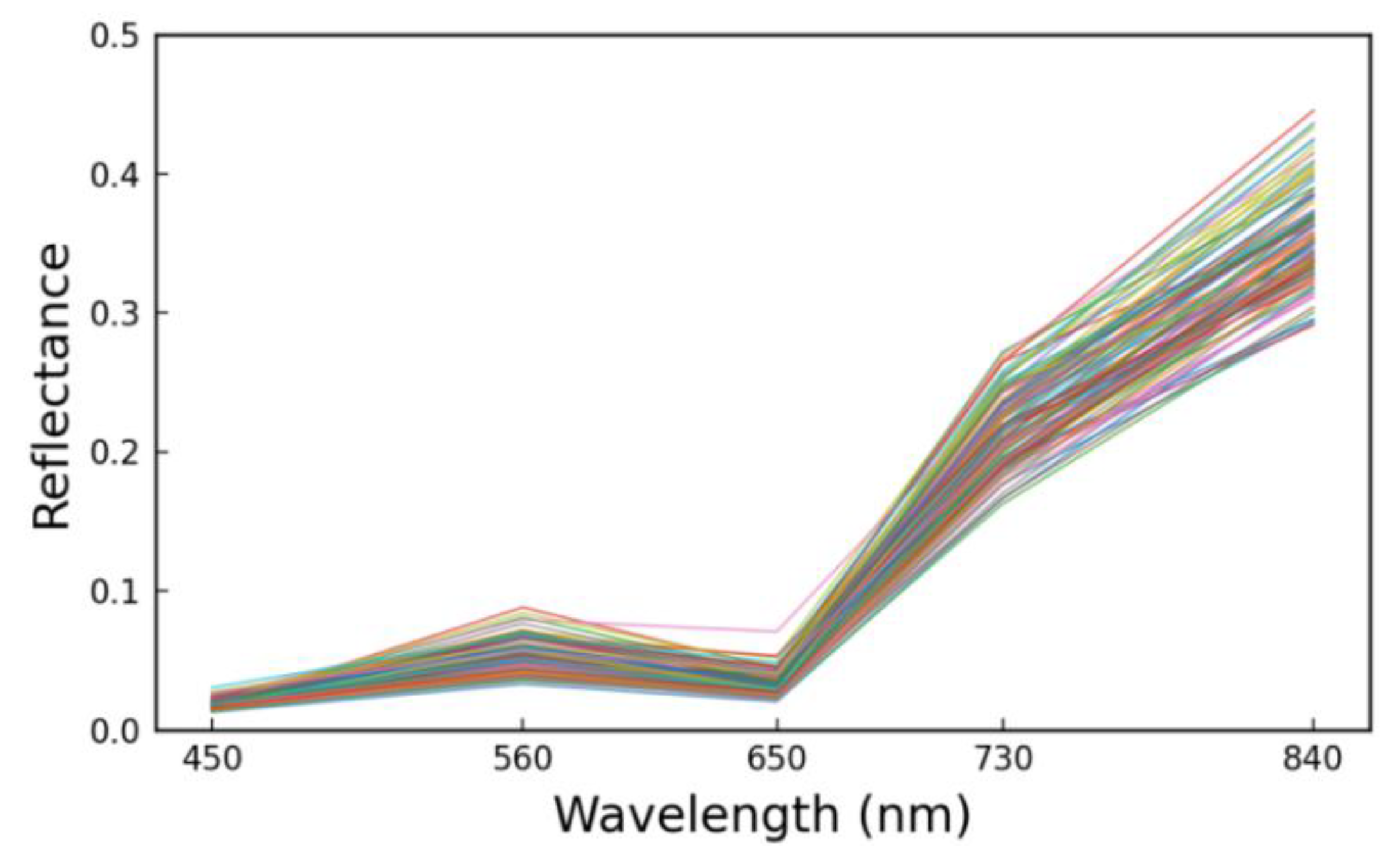 - Jiao, Q.; Sun, Q.; Zhang, B.; Huang, W.; Ye, H.; Zhang, Z.; Zhang, X.; Qian, B. A Random Forest Algorithm for Retrieving Canopy Chlorophyll Content of Wheat and Soybean Trained with PROSAIL Simulations Using Adjusted Average Leaf Angle. Remote Sens. 2021, 14, 98. [Google Scholar] [CrossRef]