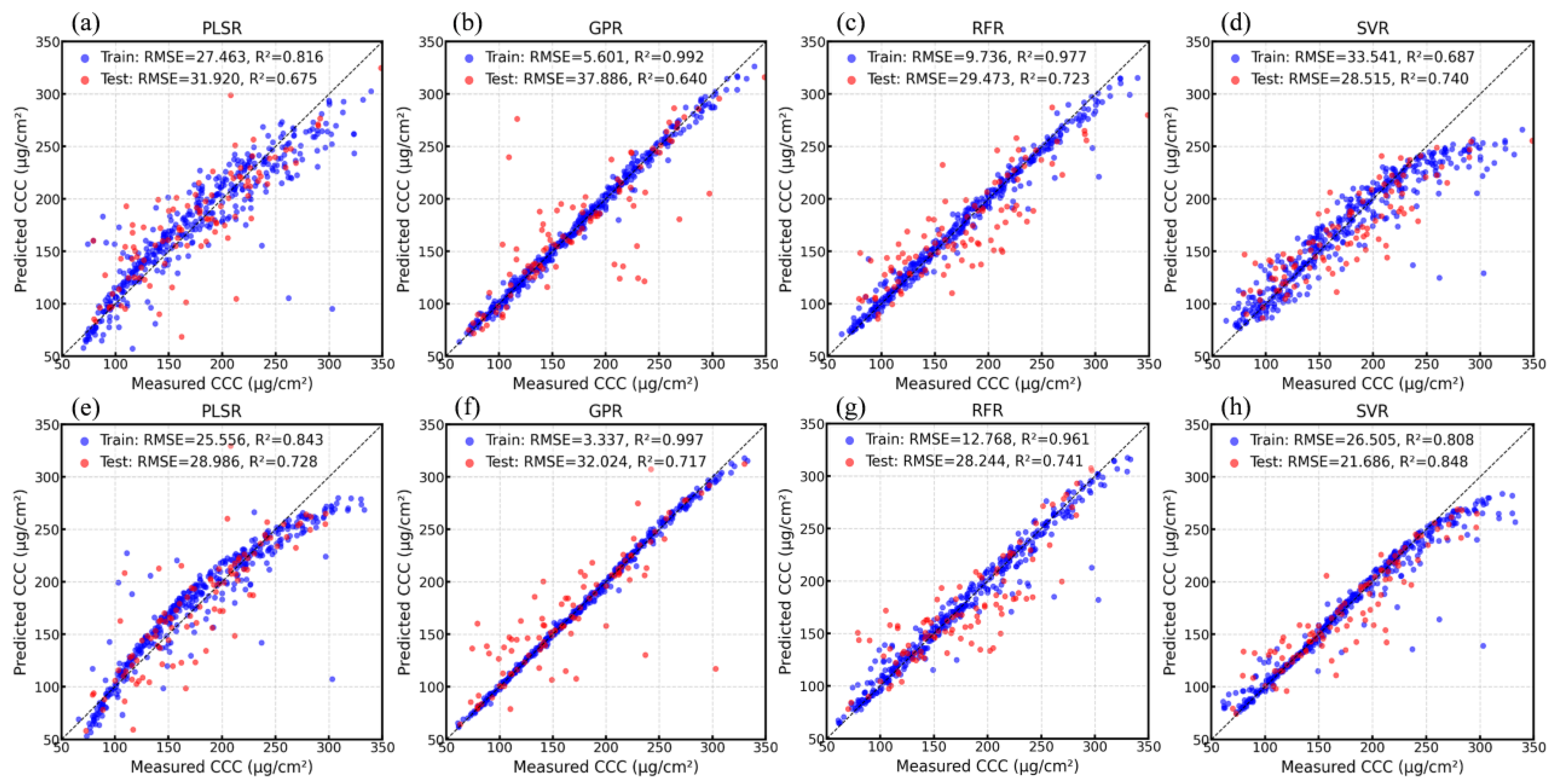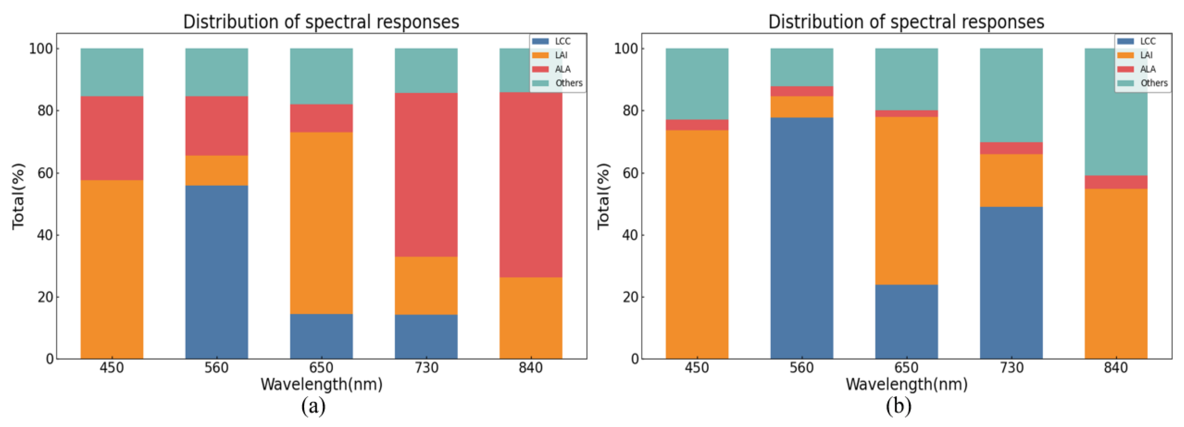 - Compared with the unadjusted versions, the ALAadj hybrid inversion model demonstrated significant performance improvements across the four machine learning methods, with the peak R2 increasing by 13.8% from 0.723 to 0.823 and the RMSE decreasing by 19.9% from 21.866 μg/cm2 to 17.521 μg/cm2.