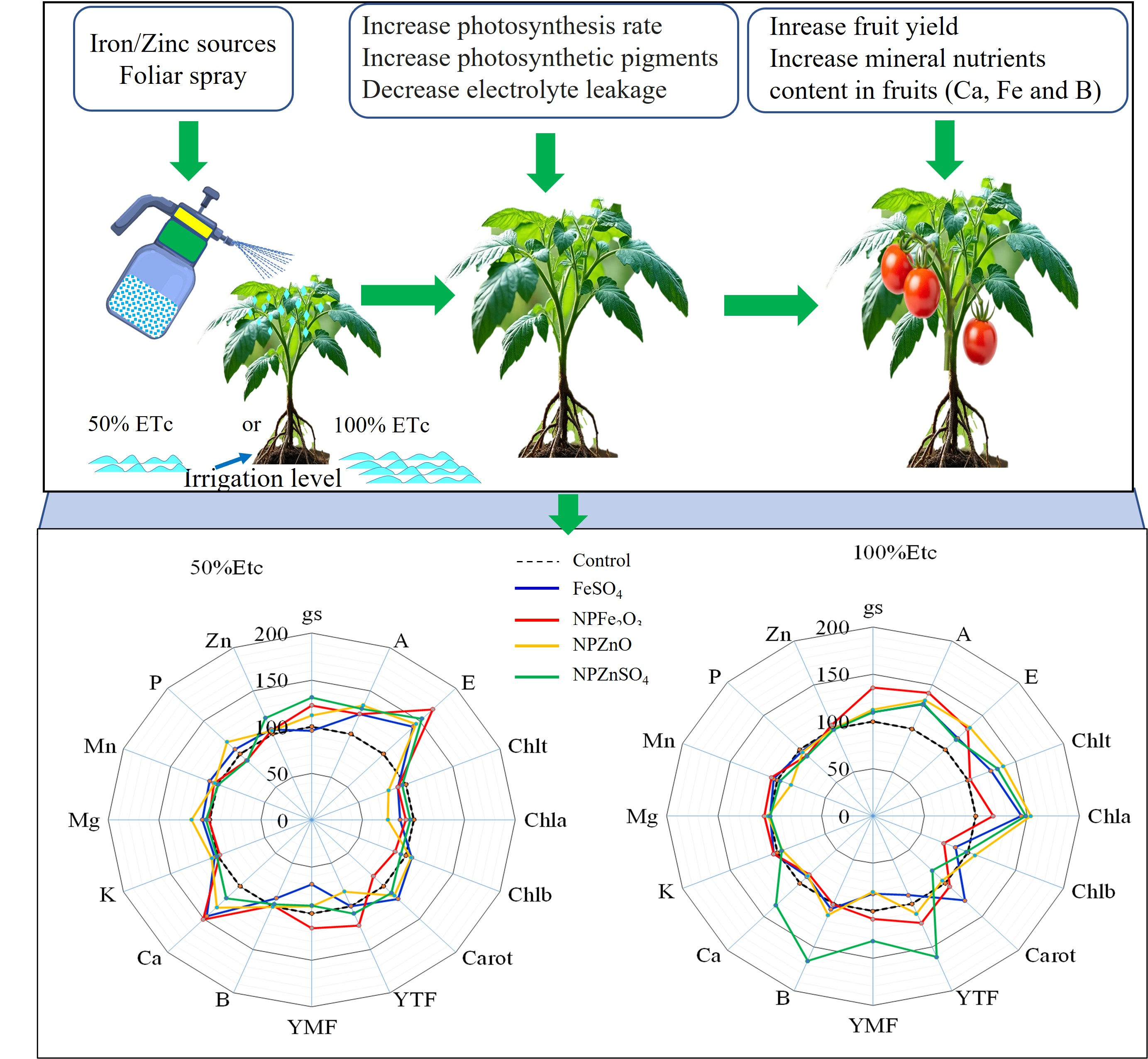 Physiological, Productive, and Nutritional Performance of Tomato Plants Treated with Iron and Zinc Nanoparticles via Foliar Application Under Deficit Irrigation