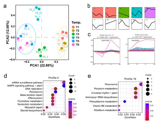 Transcriptomic profile changes during cold treatment. (a) PCA of two transcriptional data sets of cold treatment reveals separation of normal temperature samples (T1 and T2) from low-temperature samples. Moderate freezing treatment (T5) and freezing-recovery treatment (T6) form independent clusters. (b) K-means cluster analysis groups 20 expression profiles from four temperature treatments. Five profiles show significant change (p-value < 0.5). Profiles 4 and 19 are upregulated during freezing treatment. (c) In profile 4, Do021840 encodes a glycine-rich RNA-binding protein (GRP), and in profile 19, Do026322 encodes an unknown protein. The lines represent the gene expression levels. (d) KEGG pathway analysis of profile 4 shows major pathways involved with post-transcriptional regulation and oxidative stress. (e) KEGG pathway analysis of profile 19 shows major pathways involved with amino acid biosynthesis, riboflavin, and vitamin B6 metabolism.