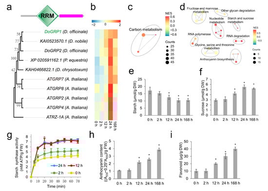 GRPs play a key role in regulating RNA processes by containing a conservative domain, RNA recognition motif (RRM). To have an overview of DoGRP1’s response to low-temperature induction, we further detected the DoGRP1 expression level from 285 K to 268 K. DoGRP1 was specially induced under chilling temperatures (277 K) (Figure S2). Phylogenetic analysis showed that homologs of DoGRP1 in the model plant Arabidopsis were ATGRP7 and ATGRP8 (Figure 2a). We found that these GRP homologous genes exhibited similar chilling-temperature-induced patterns (277 K) during a time course of 0–168 h. DoGRPs and ATGRP7 retained their higher expression levels at 168 h (Figure 2b). To explore the GRP-mediated metabolism under chilling temperatures, a Gene Set Enrichment Analysis (GSEA) was performed with 858 ATGRP7 genome-wide binding transcripts []. The core carbon metabolic pathway was upregulated under chilling temperatures (Figure 2c). Furthermore, co-orthologs of ATGRP7-binding transcripts in the D. officinale genome were analyzed. KEGG analysis showed that RNA processes, starch and sucrose metabolism, and anthocyanin biosynthesis were enriched in the chilling response (Figure 2d). The starch content of the chilling treatment after 12 h was significantly lower than that of 0 h (Figure 2e). In contrast, the sucrose content was increased during the chilling treatment (Figure 2f). We further detected starch synthase activity, which was specially induced under chilling temperatures at 12 h (Figure 2g). The anthocyanin and flavonoid content continued to increase for 12 h (Figure 2h,i). Thus, these results suggested that GRPs mediated the pivotal flavor compounds accumulation by regulating downstream gene expression at chilly temperatures, affected by carbohydrate and anthocyanin metabolism in D. officinale.