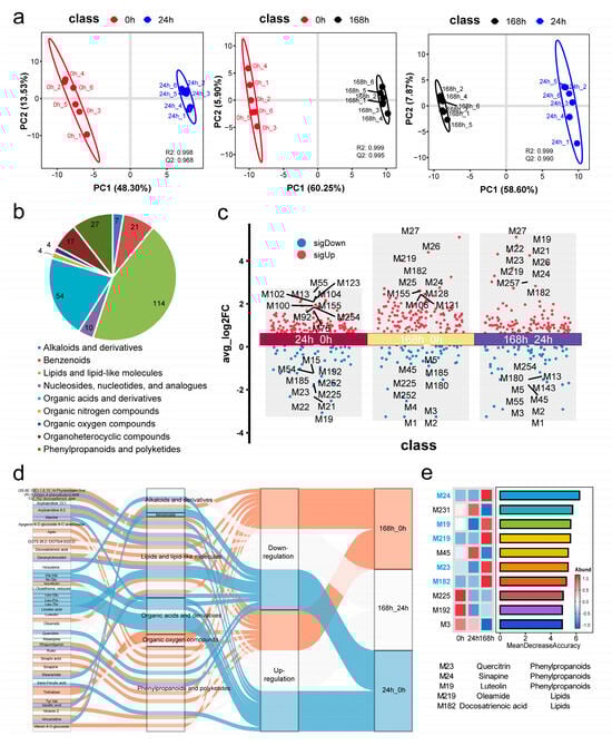 Metabolic profile changes over time during chilling storage. (a) PLS-DA is employed to analyze the maximization of between-group differences in metabolites. The model exhibits good fit and predictive validity and is subjected to 200 permutation tests in Figure S4. (b) Superclass information indicates most of the metabolite classifications are connected to lipid (44.2%), organic acid (20.9%), and phenylpropanoid (10.5%) derivatives. (c) DAMs are selected with a VIP > 1 and p value < 0.05 in three comparisons. The top ten metabolites are labeled in the volcano plot. (d) These metabolites mainly flow toward alkaloid, lipid, organic acid, and phenylpropanoid metabolism and accumulate at different treatment time points. (e) Random forest model identifies top metabolites with high accuracy. Three phenylpropanoids and two lipids are abundant in 168 h of chilling.