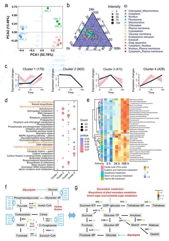Integrated analysis of metabolism effects under chilling temperature. (a) PCA of the proteome at chilling temperature indicates the two principal contribution rates are 52.78% and 13.49%, respectively. (b) Distribution of proteins according to location at three time points. Sixty percent of protein locations appear from 24 h to 0 h. Most proteins are located in the chloroplast, cytoplasm, and nucleus. Dots represent proteins, sizes represent quantities, and colors represent locations. The dotted circle indicates the trend of proteins location. (c) K-mean shows that a total of 2417 proteins are grouped into four clusters. The line represents the genes expression level, and the thick line represents the K-mean of all genes expression level. (d) KEGG mapping of the pathway shows the protein composition in each cluster. (e) The protein abundance levels of four pathways in cluster 4, including TCA cycles, Cys, Met, Glu, starch, sucrose, and vitamin 6 metabolism. (f,g) A systematic view on the variation in amino acid, starch, and sucrose metabolism. Significant increases in (FC > 2) protein in 168 h vs. 0 h are labeled in the pathway.