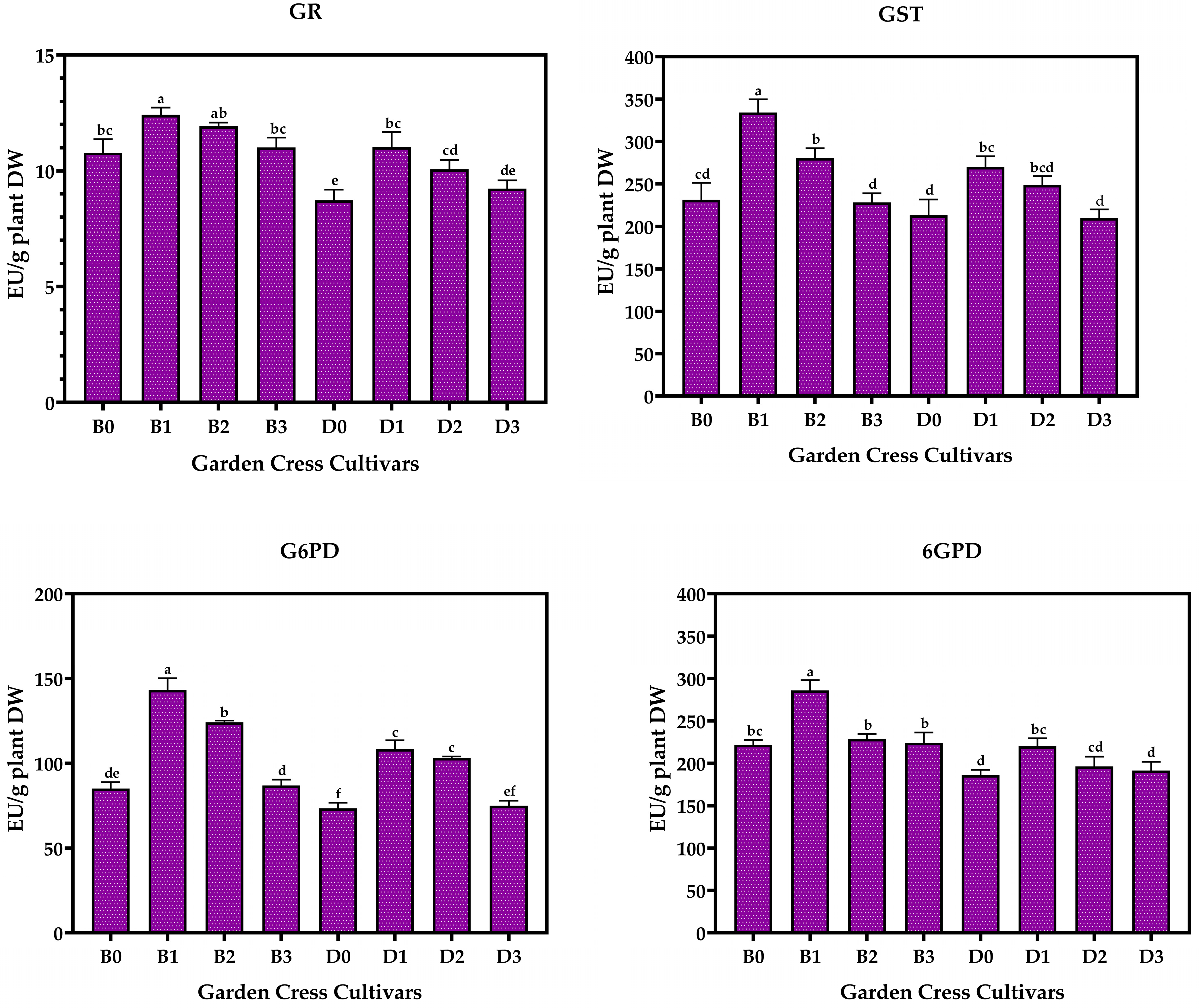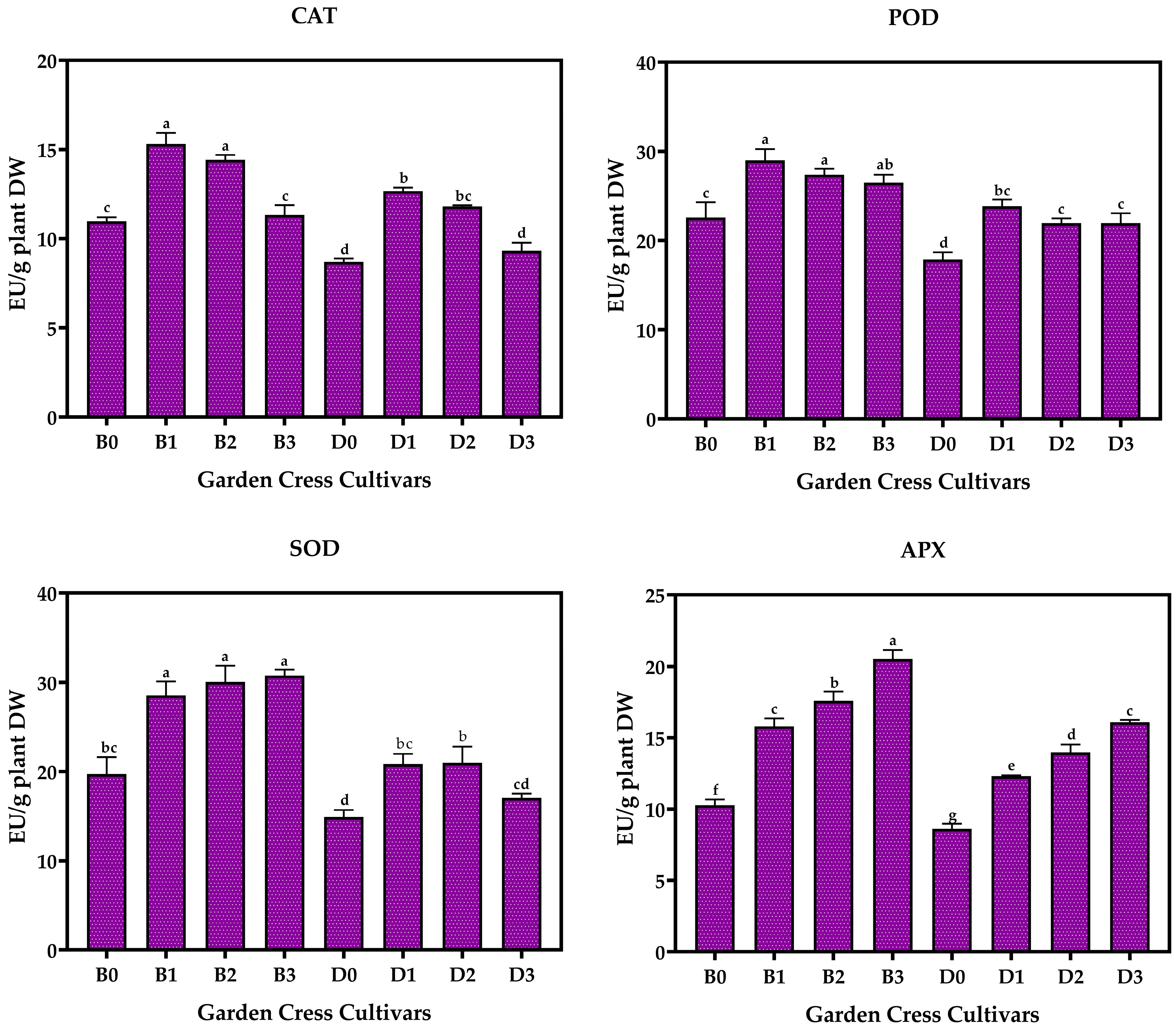 3.2. Antioxidant Enzyme Levels of Garden Cresses