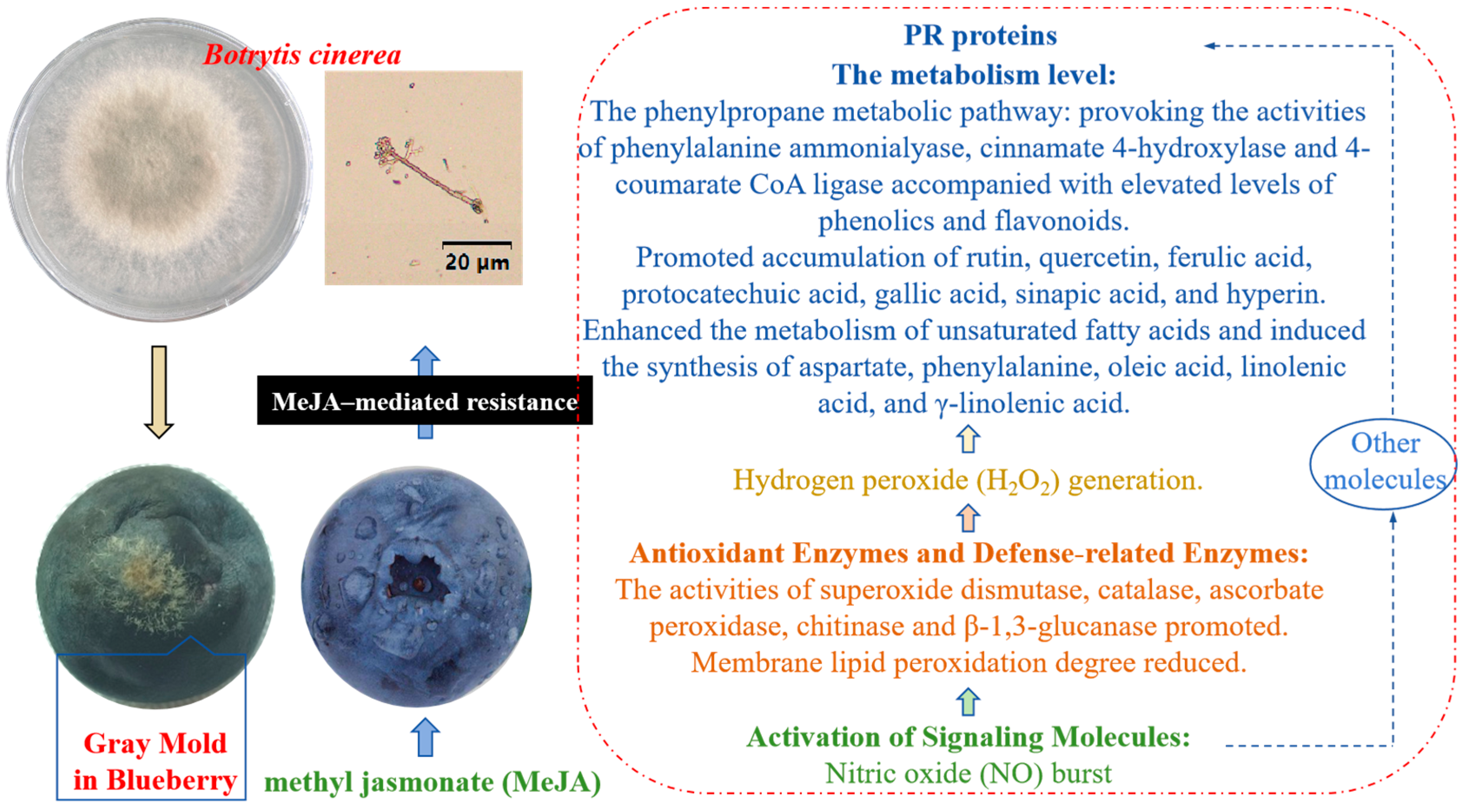 - Wang, H.; Kou, X.; Wu, C.; Fan, G.; Li, T. Methyl jasmonate induces the resistance of postharvest blueberry to gray mold caused by Botrytis cinerea. J. Sci. Food Agric. 2020, 100, 4272–4281. [Google Scholar] [CrossRef]