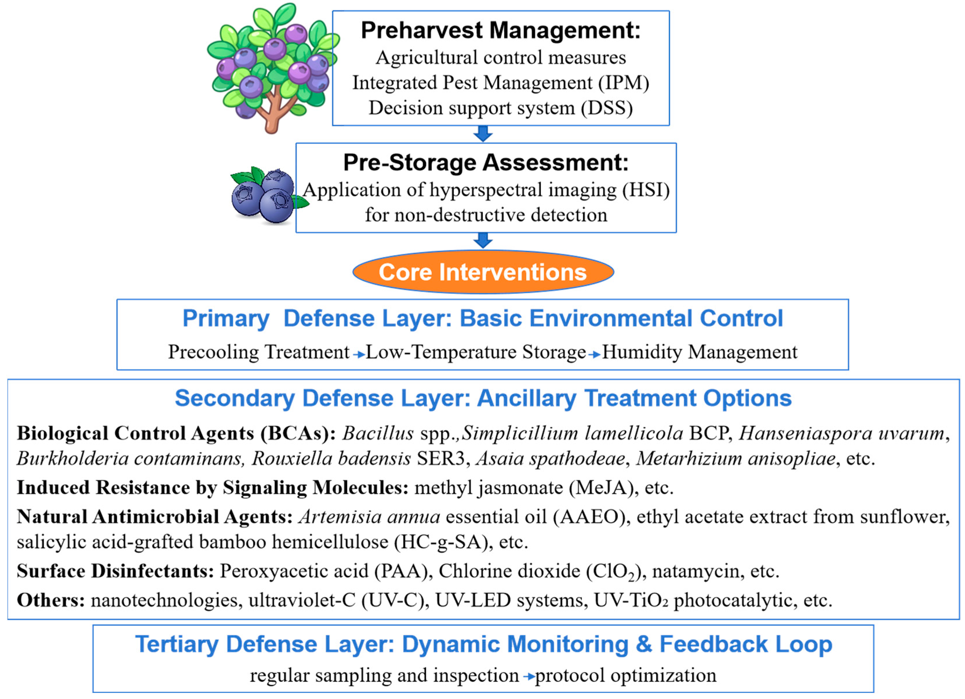 - Neugebauer, K.A.; Mattupalli, C.; Hu, M.; Oliver, J.E.; VanderWeide, J.; Lu, Y.; Sullivan, K.; Stockwell, V.O.; Oudemans, P.; Miles, T.D. Managing fruit rot diseases of Vaccinium corymbosum. Front. Plant Sci. 2024, 15, 1428769. [Google Scholar] [CrossRef]