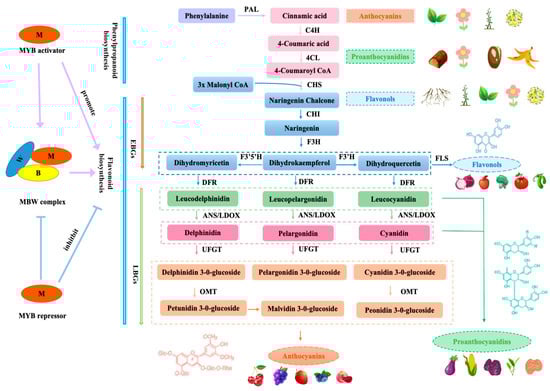 In current horticultural crop studies focusing on secondary metabolism, the metabolic pathways underlying flavonoid biosynthesis have been characterized in greater detail (Figure 1). As a conserved and pivotal component of the phenylpropanoid pathway across plant taxa, flavonoid biosynthesis is governed by two primary gene categories: structural genes, further classified into early and late subsets []. In the anthocyanin branch, enzymes such as CHS, CHI, F3H, F3′H, and F3′5′H constitute the EBGs, while DFR, ANS/LDOX, and UFGT are designated as LBGs []; regulatory genes exemplified by transcription factors (Table 1). Key enzymes in the anthocyanin pathway are coordinately regulated by the MBW transcriptional activation complex, comprising members from the MYB, bHLH, and WD40 repeat protein families, as well as additional TFs such as WRKY and NAC []. The synthesis of flavonoids begins with phenylalanine within the phenylalanine pathway, where phenylalanine aminolyase serves as the initial enzyme. Phenylalanine Ammonia-Lyase (PAL)catalyzes the conversion of phenylalanine into cinnamic acid, subsequently processed by cinnamic acid-4-hydroxylase and 4CL4-coumarate coenzyme A ligase to yield 4-coumaroyl coenzyme A. Chalcone synthase then acts on malonyl coenzyme A and 4-coumaroyl coenzyme A, producing chalcone. While chalcone isomerase (CHI) is not mandatory for this reaction in plants, its absence slows down the process significantly, showcasing tissue-specific expression. Dihydroflavonols are generated from 4,5,7-trihydroxyflavanones catalyzed by flavanone 3-hydroxylase, a common substrate for flavonoid 3′-hydroxylase and flavonoid 3′,5′-hydroxylase. F3H plays a regulatory role in the synthesis of flavonols and anthocyanin products and is a key enzyme in the metabolic pathway of flavonoid substances with a central position in the whole flavonoid metabolism process. Dihydroxyflavonol reductase, reliant on NADPH, catalyzes the formation of colorless anthocyanins from flavonols. Its expression varies across species and tissues. These colorless anthocyanins are later oxidized by anthocyanin synthase into colored anthocyanins. Anthocyanins, inherently unstable, undergo modification by uridine diphosphate glucosyltransferase, leading to glycosylation, hydroxylation, and methylation, ultimately producing stable, colored anthocyanins. Alternatively, anthocyanin reductase and colorless anthocyanin reductase facilitate the conversion of unmodified colorless anthocyanins or anthocyanins into proanthocyanidins [] (Figure 1).