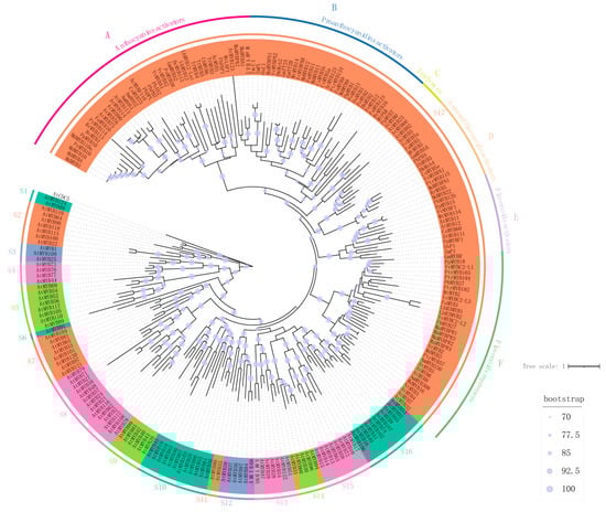 Phylogenetic tree of the R2R3-MYB genes in Arabidopsis thaliana [] and functionally characterized genes related to flavonoid biosynthesis in plants. The tree was constructed by the maximum likelihood (ML) method using IQ-TREE 2, and ModelFinder was used to choose the best model. The tree was rooted using AtCDC5 as the outgroup. Bootstrap values ≥ 50% are shown as dark blue dots in the phylogenetic tree. The candidate R2R3-MYB proteins are clustered into 17 subfamilies (designated as S1 to S17). And the S17 subfamily is further divided into six groups, namely A (anthocyanin activators), B (proanthocyanidin activators), C (trichomes), D (general flavonoid activators), E (flavonol activators), and F (flavonoid repressors).