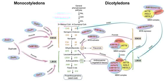 MYB transcription factors in plants stand out from their animal and yeast counterparts due to their remarkable structural and functional conservation. They serve as pivotal players in a diverse array of biological processes, exerting a unique influence on plant growth. Engaging in multiple facets of plant development, MYB transcription factors govern cell fate, morphogenesis, and various developmental stages. They also oversee primary and specialized metabolic pathways, as well as orchestrate responses to both biotic and abiotic stresses. Notably, MYB transcription factors are actively involved in plant flavonoid metabolic pathways, regulating flower, fruit, and seed color, among others, in monocotyledonous plants such as rice and maize, and in dicotyledonous plants such as Arabidopsis thaliana. EBGs in Arabidopsis are activated by functionally redundant R2R3MYB regulatory genes (MYB11, MYB12, and MYB111), and the initiation of LBGs requires the MYB regulatory factor and bHLH factor, as well as the WD40 protein to make up the ternary MBW complex. In contrast, in monocotyledonous maize and rice, the MBW complex can activate both EBGs and LBGs as a single unit; therefore, we suggest that the regulatory mechanism of flavonoid synthesis in dicotyledons is different from that in monocotyledons (Figure 3). In Arabidopsis, the early synthetic genes EBGs associated with flavonoid synthesis are regulated by AtMYB12/PFG1 [], and the late synthetic genes, LBGs, are mainly regulated by AtMYB75/PAP1, AtMYB90/PAP2, AtMYB5, AtMYB123/AtTT2, AtMYB113, AtMYB114 [,,,], AtMYB3, AtMYB4, AtMYB7, and MYB32 overexpression inhibited both early synthesis genes EBGs and late synthesis genes, LBGs [,,], AtMYBL2 and AtCPC also inhibited the control of flavonoid production [,]. In monocotyledonous plants, of all the MYB genes present in the model plant rice, OsP1 (PERICARP COLOUR1) and OsMYB3/Kala3 are overexpressed to increase the transcriptional level of EBGs, and OsC1 (COLOURESS1) is overexpressed to increase the transcriptional level of LBGs, promoting the production of anthocyanins [,,]. In another model plant, maize, ZmP1 is overexpressed to increase the transcriptional level of EBG [], and ZMC1 and ZMPL are overexpressed to increase the transcriptional level of EBGs and LBGs, which promote the production of flavonoids [,].
