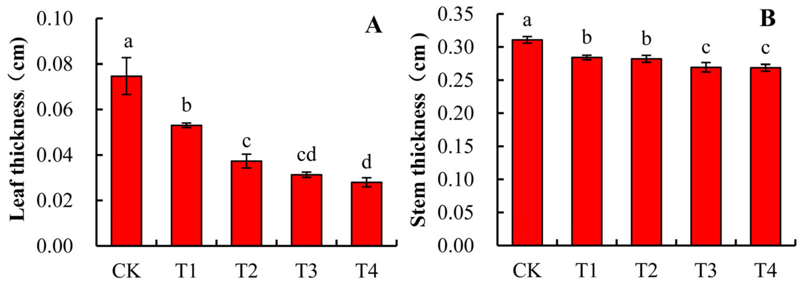 2.3. Measurement of Stem Diameter and Leaf Thickness